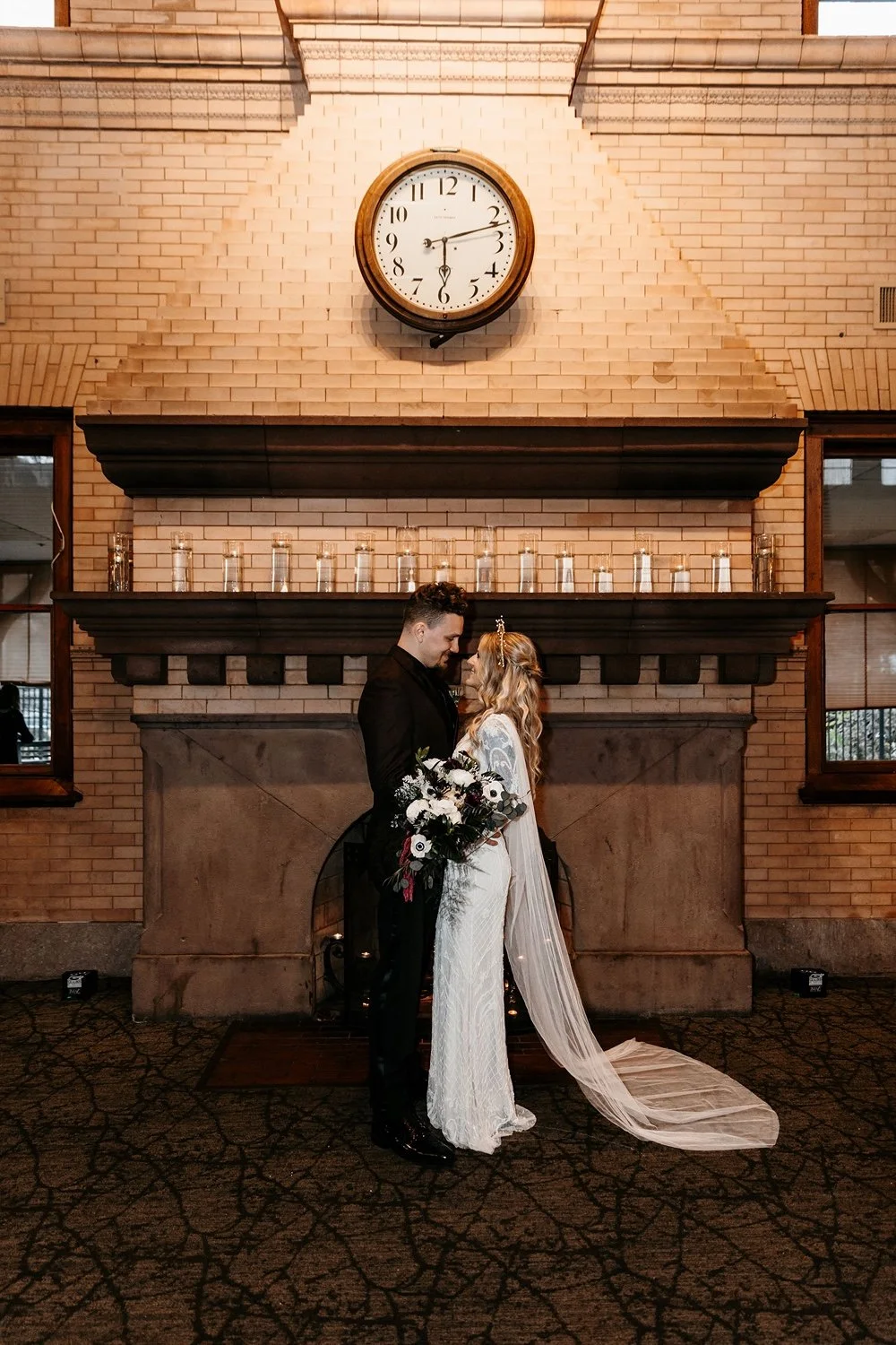 Let’s take a moment for the VENUE PEOPLE! Union Station Northampton was the perfecttttt spot for Lauren & Brian’s Massachusetts October wedding. Because the venue is a literal old train station, it gave off all the dark and spooky vibes that L & B wanted for their Halloween/fall wedding. The Roosevelt Room at Union Station Northampton has classic brick walls that are gorgeous on their own OR serve as a blank slate for whatever you want to transform the space into. It can hold anywhere from 25 to 100 people, so you can get married here whether you’re having a cute lil’ intimate wedding or a fuggin’ PARTAY.